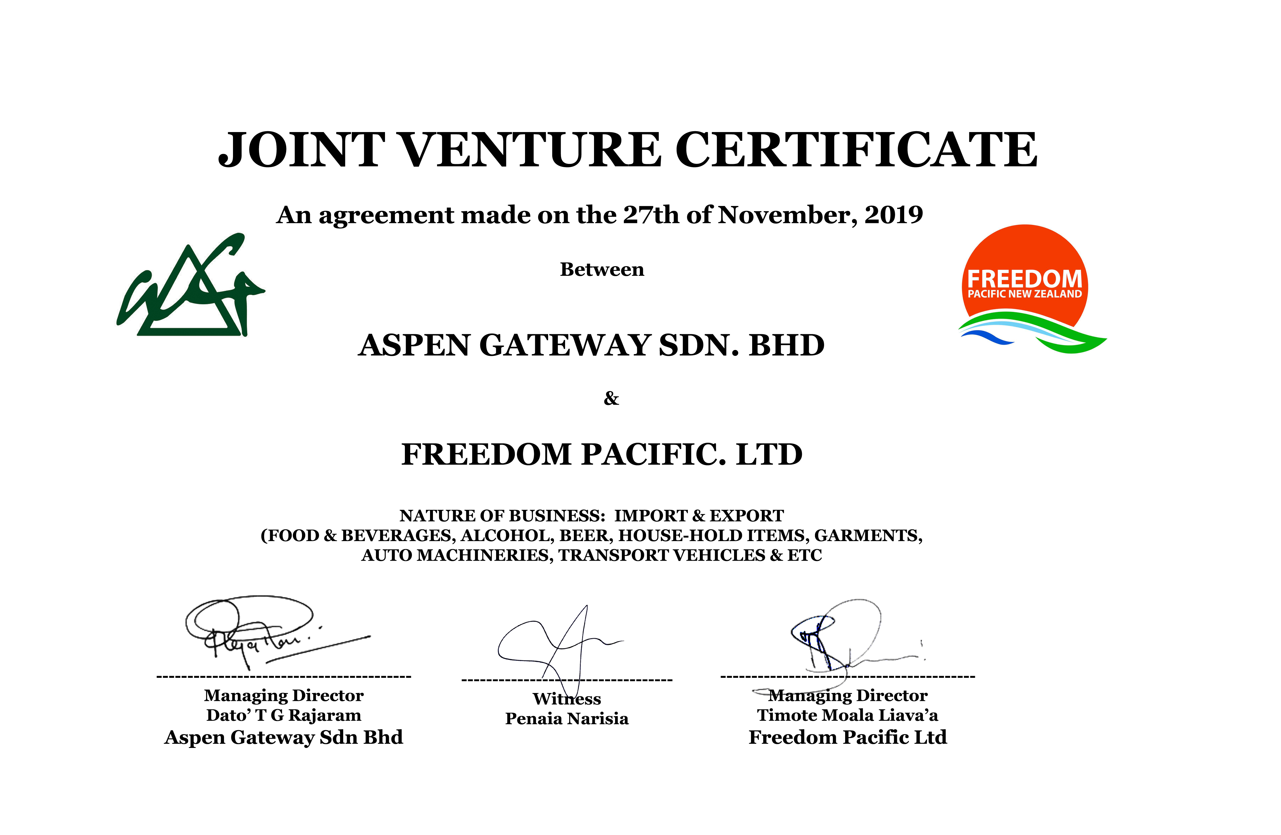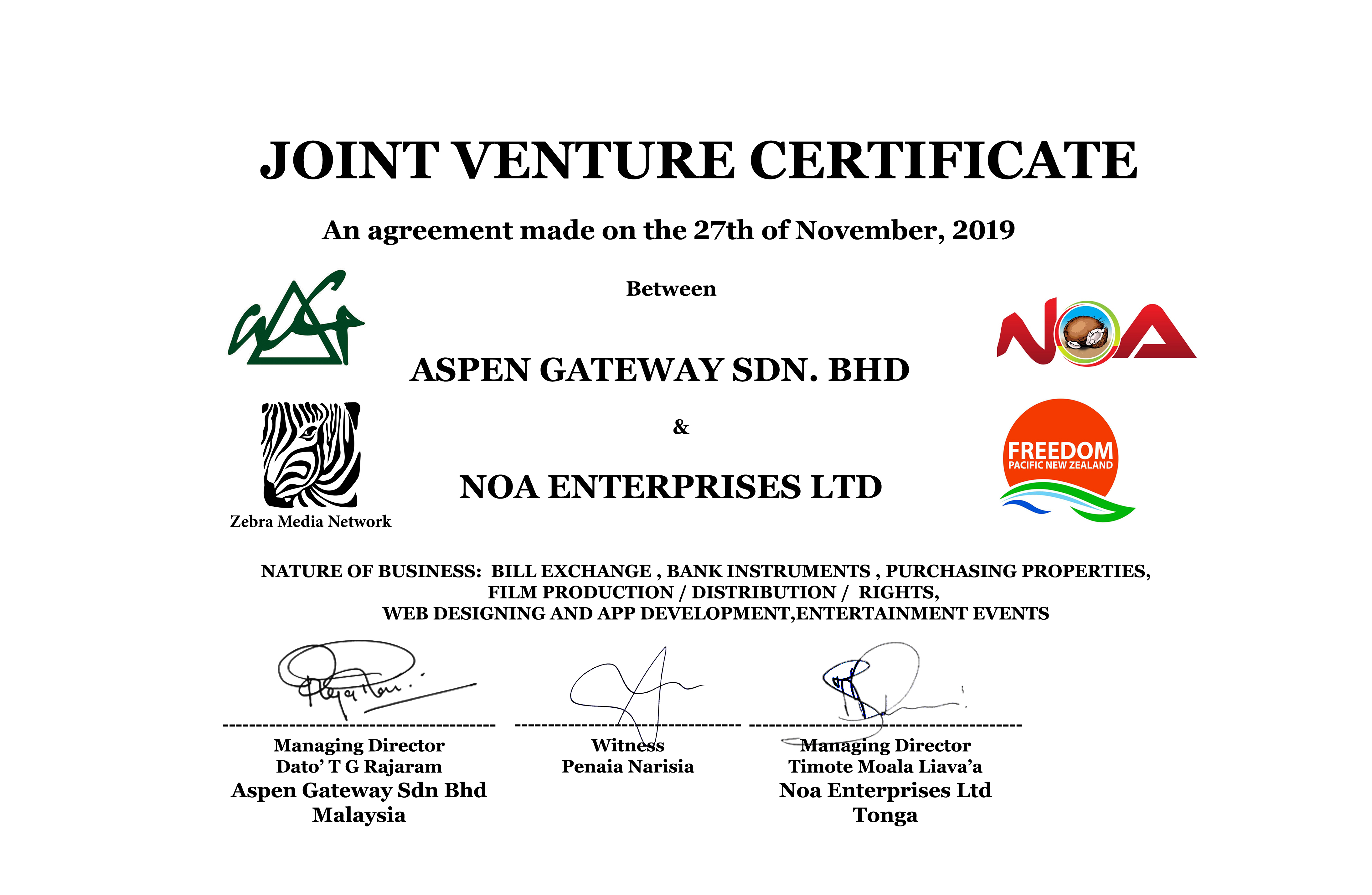 We have embodied a strategic alliance relationship with all our partners around the globe. We have been working closely with Noa Enterprises Ltd & Freedom Pacific Ltd in Tonga, and with Topway (Shen Zhen) Trading Limited in Hong Kong.